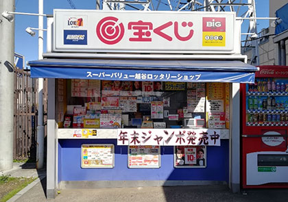 神奈川県大和市にあるマルエツ鶴間大黒天宝くじです。小田急線鶴間駅から徒歩5分ほどに位置する「マルエツ鶴間店」の敷地内で営業しています。