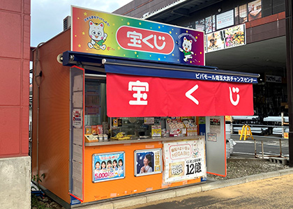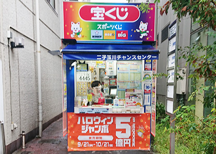 東急田園都市線『二子玉川駅』を出て、玉川高島屋SC前のスクランブル交差点の二子玉川公園通りを右折し、50メートル先の左側に売り場はあります。宝くじでは2009年11月営業開始以来、多くのお客さまにご愛顧いただいている売り場です。