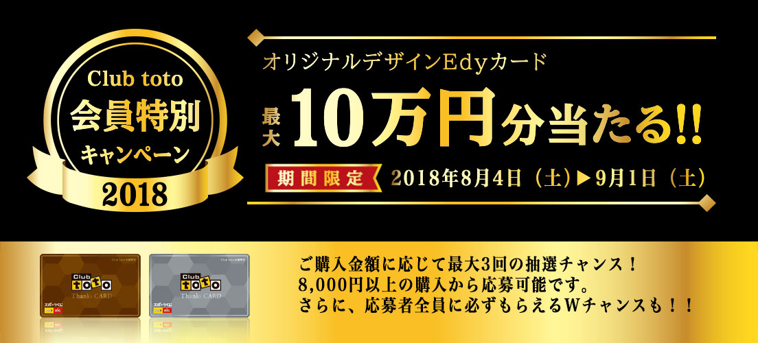 - 抽選結果の発表は、賞品の発送をもって代えさせていただきます(2018年9月~10月頃予定)。Club totoに登録された住所に発送いたします。