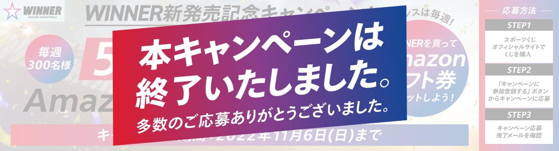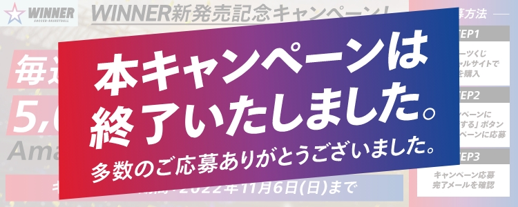 キャンペーン期間中、Club toto会員として、スポーツくじオフィシャルサイト(ネット決済、コンビニ決済)、くじ売り場※1でWINNERを購入しキャンペーンに応募すると、Amazon ギフト券(Eメールでお届け)5,000円分が抽選で毎週300名様に当たるキャンペーンを6週間連続で実施します!