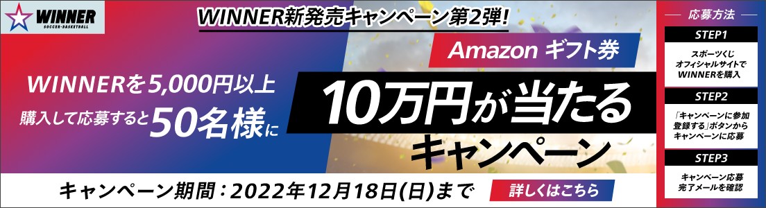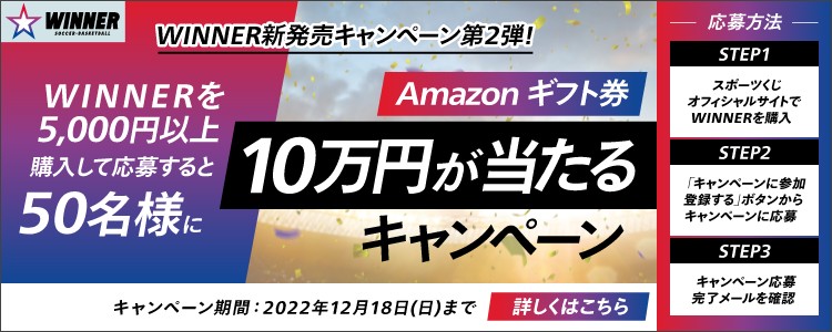 キャンペーン期間中、Club toto会員として、スポーツくじオフィシャルサイト(ネット決済、コンビニ決済)、くじ売り場※1でWINNERを購入しキャンペーンに応募すると、Amazon ギフト券(Eメールでお届け)10万円分が抽選で50名様に当たるキャンペーンを実施します!