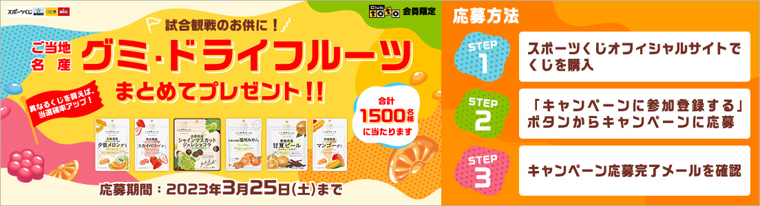 キャンペーン期間中、Club toto会員として、スポーツくじオフィシャルサイト、くじ売り場、コンビニエンスストアでスポーツくじを合計1,500円以上購入しキャンペーンに応募された方を対象に、各地方のご当地グミやドライフルーツを抽選で合計1,500名様(各コース250名様)にまとめてプレゼント!