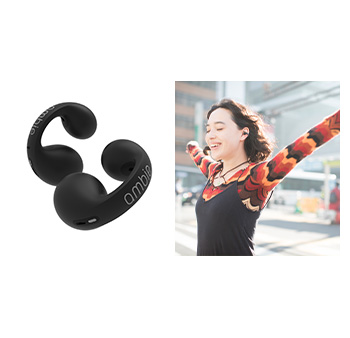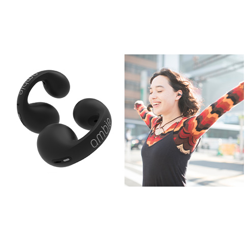 耳をふさがないイヤホンambie!イヤカフ型のデザインのためアクセサリー感覚で楽しめる。