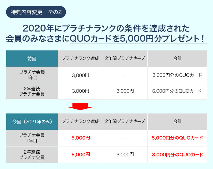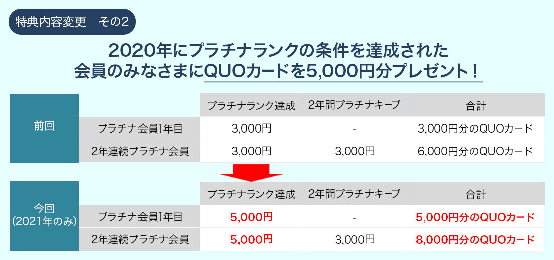 - ⑤の特典では、2年連続してプラチナランクをキープされた方には、さらに限定賞品をご用意しています。