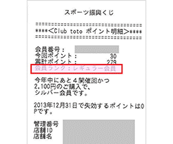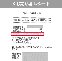 - ポイント数は、スポーツくじオフィシャルサイトの会員ページ、くじ売り場で発行されるレシート、スポーツくじ取扱いコンビニ店頭端末でご確認いただけます。