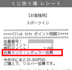 スポーツくじオフィシャルサイトにご利用のClub toto IDでログインし、会員トップページでご確認ください。ランクはご購入実績により自動的に設定されます。また、くじ売り場では、ご購入時のレシートに表示されます。