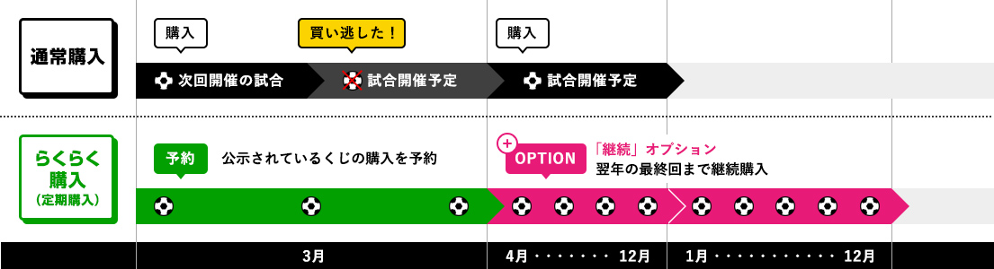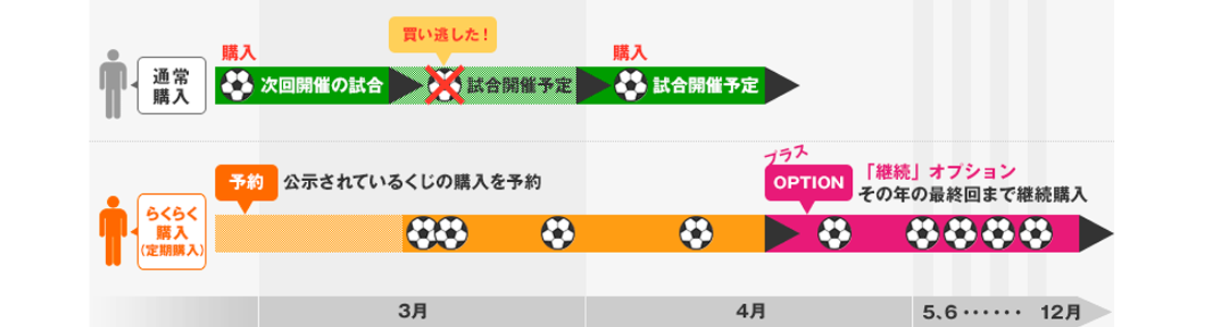 | 購入できない場合 | 以下の場合は、「らくらく購入(定期購入)」によるくじ購入が完了しません。予めご了承ください。 ・くじが中止になった場合 ・決済に選択されたカードの1か月のくじご購入可能金額上限をオーバーする場合 ・カード会社から決済不可応答があった場合 ・スポーツくじオフィシャルサイトあるいはカード会社のシステムメンテナンスにより、購入処理を行えなかった場合 ・所定の時間内(2:00~9:00)に購入処理が完了しなかった場合 ・その他何らかの理由より購入処理が完了しなかった場合 ・デビットカード決済口座残高が不足している場合 |