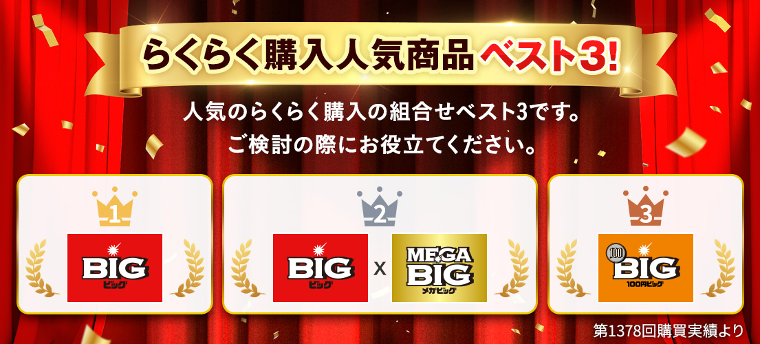 | 予約可能なくじ | BIG、MEGA BIG、100円BIG、BIG1000、mini BIG、toto、mini toto A組、mini toto B組、totoGOAL3 ※toto、minitotoA組、minitotoB組、totoGOAL3の予想はコンピュータが行います。 |