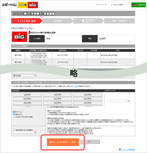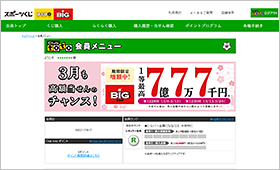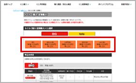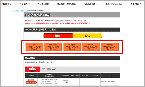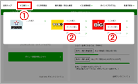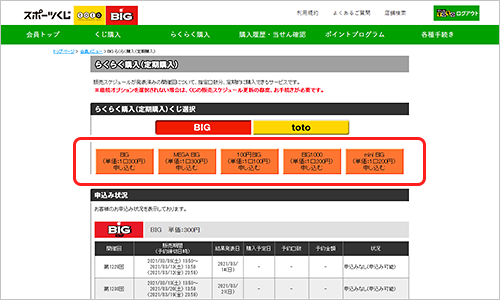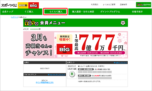 会員トップページ上部にある【①「くじ購入」】から買いたいくじ(BIGまたはtoto※)の【②「らくらく購入」】をクリック。