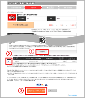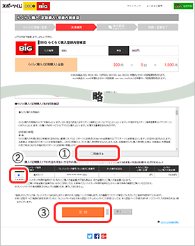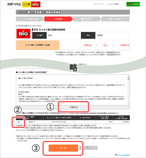 内容に問題がなければ、「規約同意確認」を確認後【①「同意する」】にチェックし、【②「お支払い方法」※】を選択。