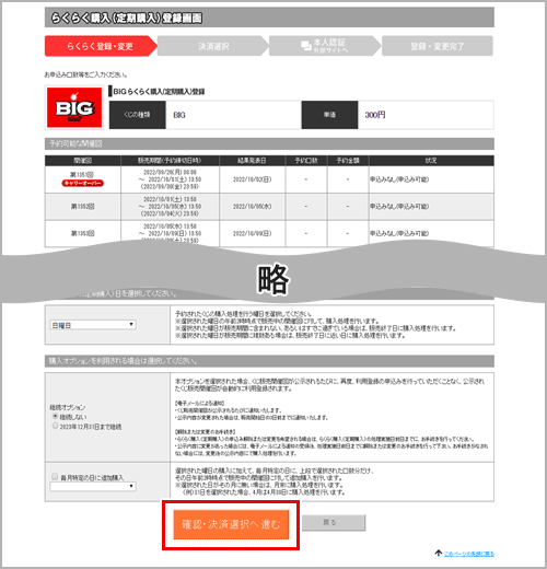 以下4項目についてそれぞれ選択して、「確認・決済選択へ進む」をクリック。