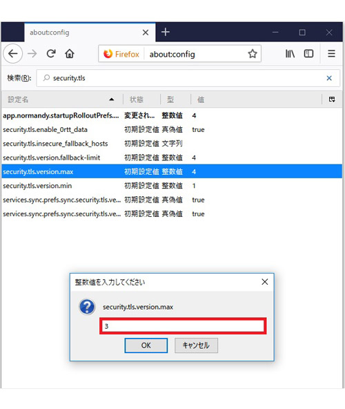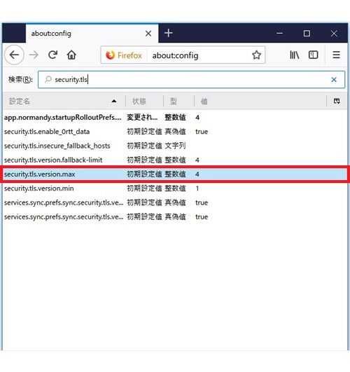 - 「設定名」の項目にある「security.tls.version.max」の行を探し、行をダブルクリックします。