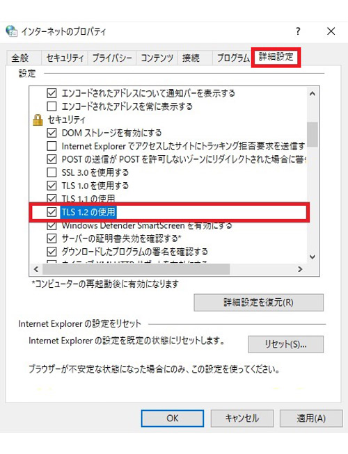 - 「詳細設定」タブを選択し、「TLS1.2の使用」にチェックが入っていない場合は、チェックを入れます。