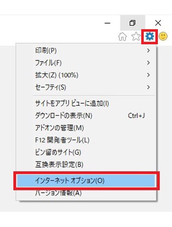 - 「ツール(歯車マーク)」をクリックし、「インターネットオプション」をクリックします。