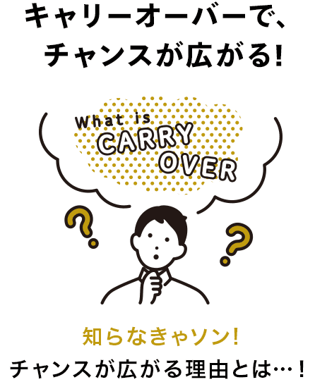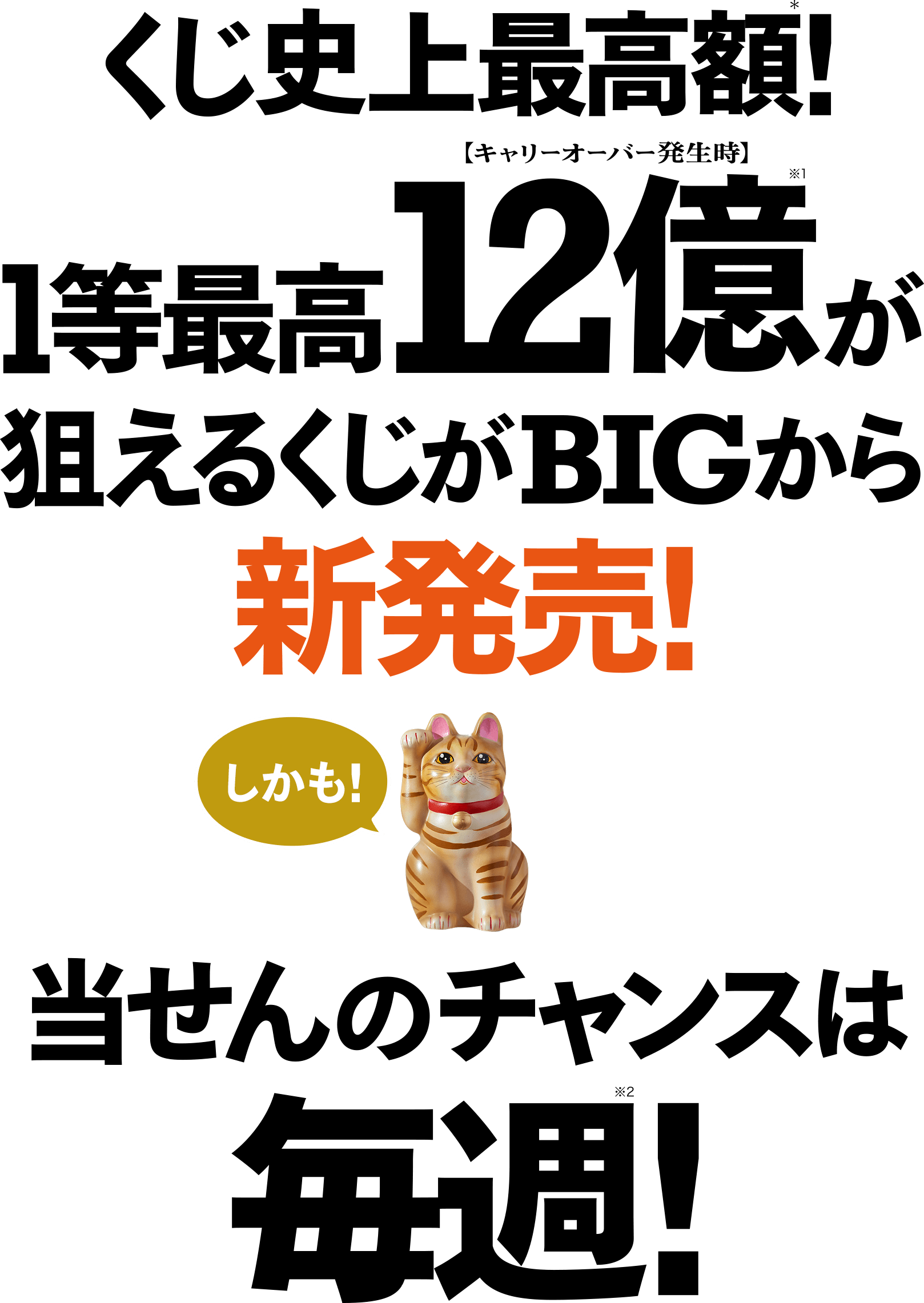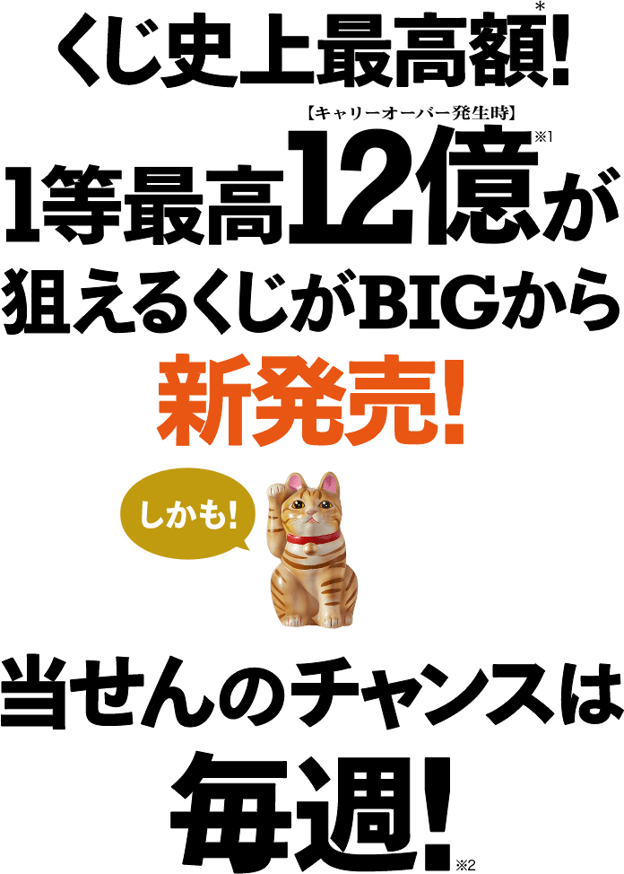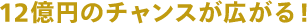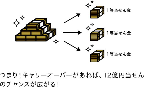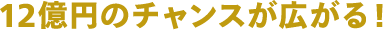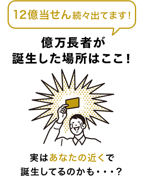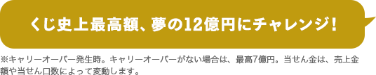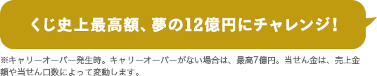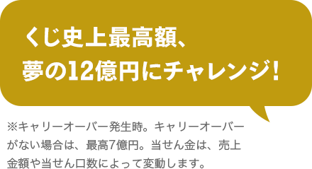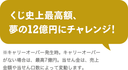 夢の12億円にチャレンジ!※ キャリーオーバー発生時。キャリーオーバーがない場合は、最高7億円。当せん金は、売上金額や当せん口数によって変動します。
