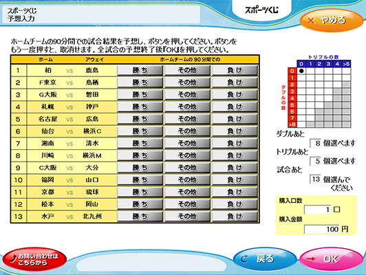 1つの試合結果を、ダブル(2通り)、トリプル(3通り)で予想ができる!