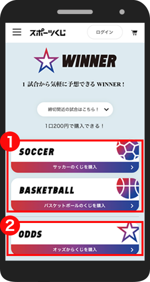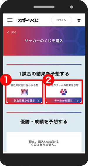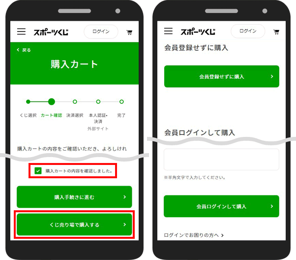 購入カートを確認し、「くじ売り場で購入する」をタップ後、会員登録せずに購入または会員ログインして購入を選択!