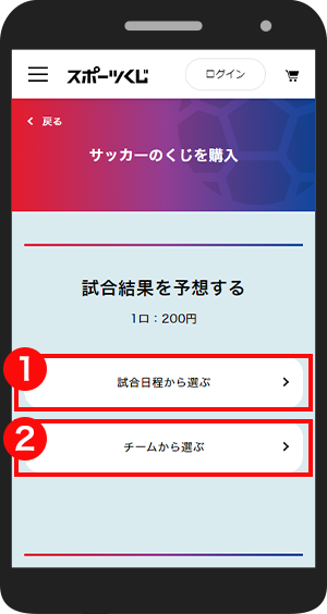 ①競技から選ぶ:「試合日程から選ぶ」または「チームから選ぶ」からお選びいただけます。