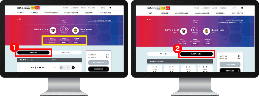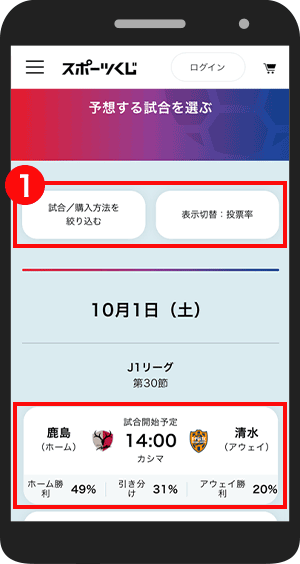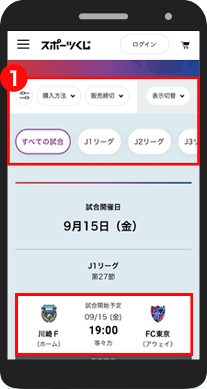 ①で試合や購入方法の絞込検索や、表示内容の切替ができます。