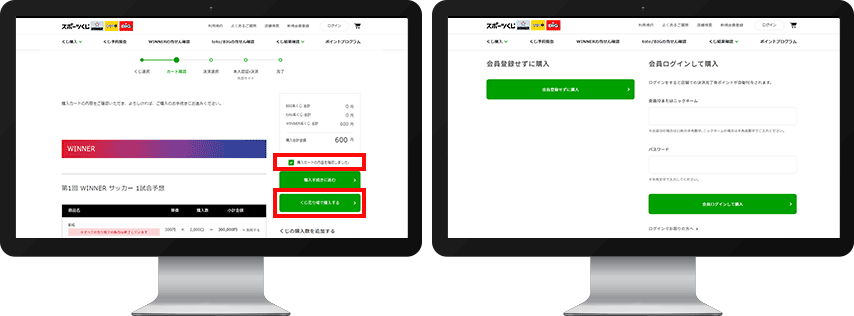 購入カートを確認し、「くじ売り場で購入する」をクリック後、会員登録せずに購入または会員ログインして購入を選択!