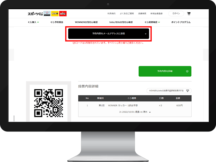 発行されたQRコードは店頭窓口でご提示ください。Club totoに入会されていない方は、「予約内容をメールアドレスに送信」ボタンをクリックし、予約内容を保存してください。