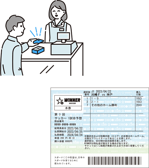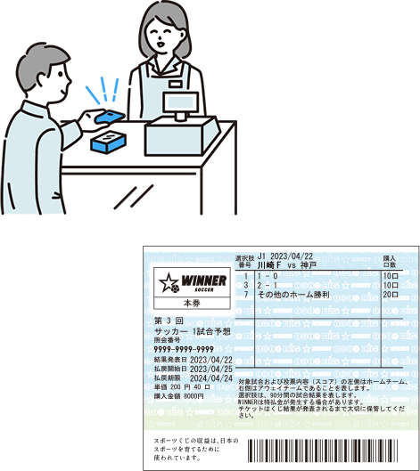 くじ売り場での購入は事前に当サイトで購入予約し、QRコードを発行する必要があります。購入予約時に発行されたQRコードを店頭窓口にて提示し、代金を支払い、チケットを受け取って購入完了となります。