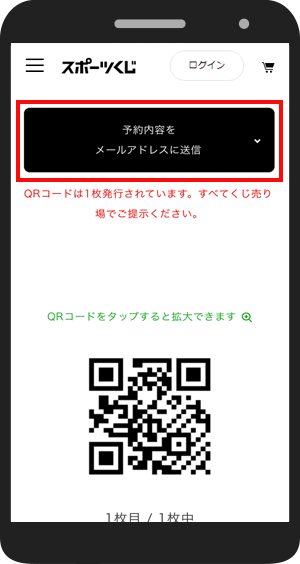 発行されたQRコードは店頭窓口でご提示ください。Club totoに入会されていない方は、「予約内容をメールアドレスに送信」ボタンをタップし、予約内容を保存してください。