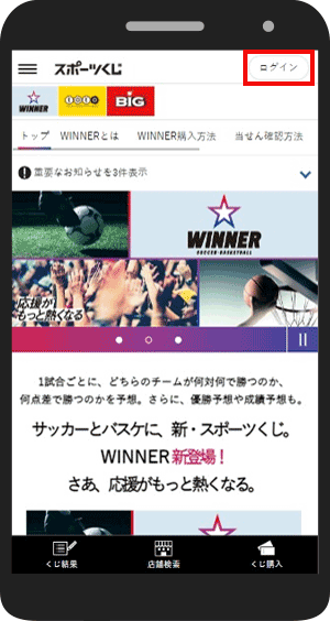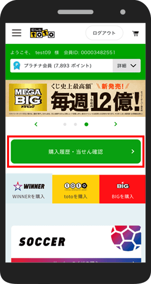 ページ上部の「購入履歴・当せん確認」をタップ。