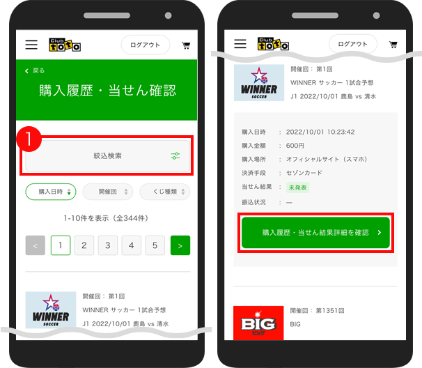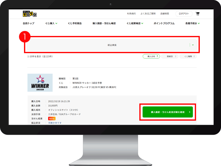 ①「絞込検索」から、購入した商品や購入時期、当せん結果などを絞り込んで検索できます。