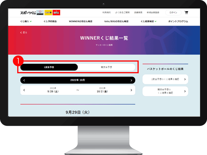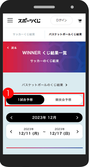 ①から「1試合予想」または「競技会予想」のくじの種類の表示切り替えができます。